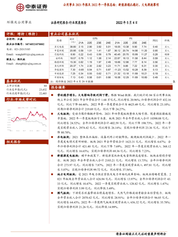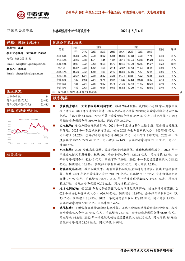 【中泰证券】【20220504】公用事业行业2021年报及2022年一季报总结:新能源稳扎稳打,火电拥抱黎明-25页
