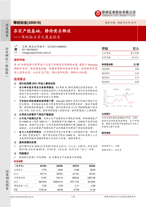 【浙商证券】【20200616】寒锐钴业首次覆盖报告:夯实产能基础,静待需求释放-20页