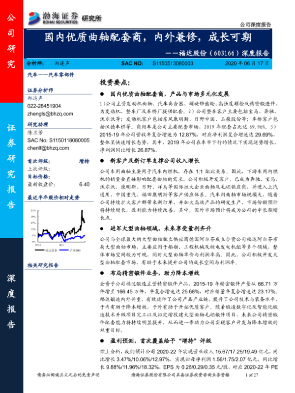 【渤海证券】【20200617】20200617-渤海证券-福达股份-603166.SH-深度报告:国内优质曲轴配套商,内外兼修,成长可期-27页