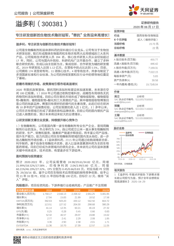 【天风证券】【20200617】溢多利-专注研发创新的生物技术隐形冠军,“替抗”业务迎来高增长!-22页