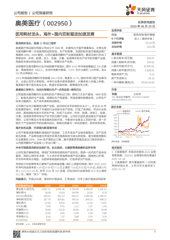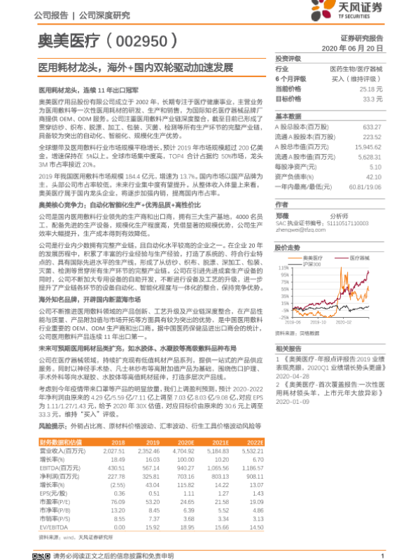 【天风证券】【20200620】奥美医疗-医用耗材龙头,海外+国内双轮驱动加速发展-20页