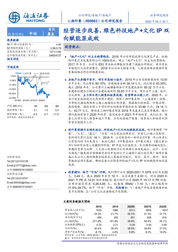 【海通证券】【20200622】20200622-海通证券-三湘印象-000863.SZ-公司研究报告:经营逐步改善,绿色科技地产+文化IP双向赋能显成效-22页