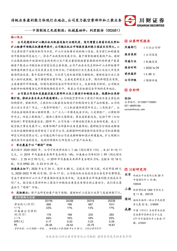 工装设计制造 盈利能力 航空航天零部件 辊压机 利君股份