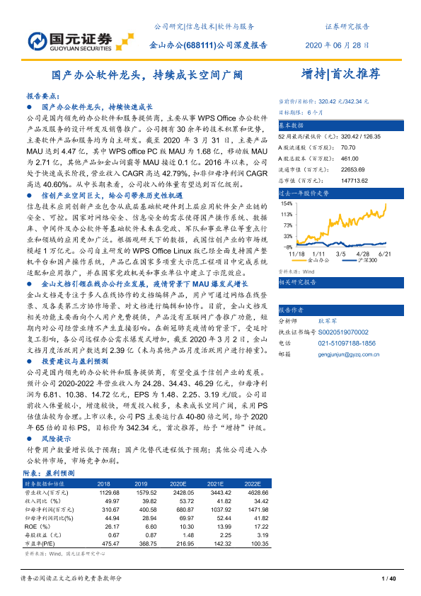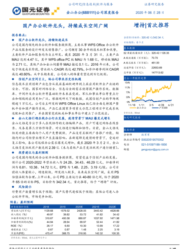 【国元证券】【20200628】20200628-国元证券-金山办公-688111.SH-公司深度报告:国产办公软件龙头,持续成长空间广阔-40页