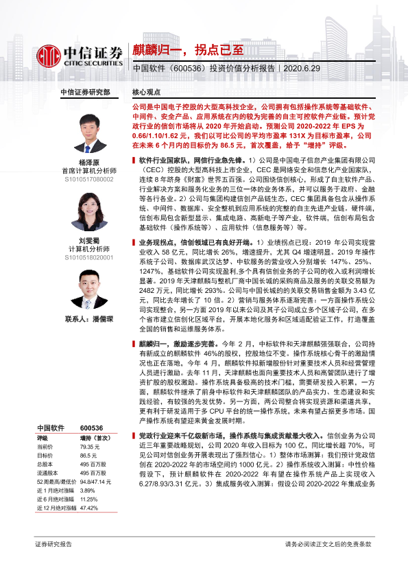 【中信证券】【20200629】20200629-中信证券-中国软件-600536.SH-投资价值分析报告:麒麟归一,拐点已至-38页