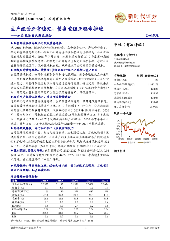 【新时代证券】【20200629】永泰能源首次覆盖报告:生产经营正常稳定,债务重组正稳步推进-21页