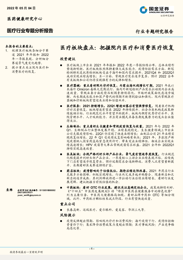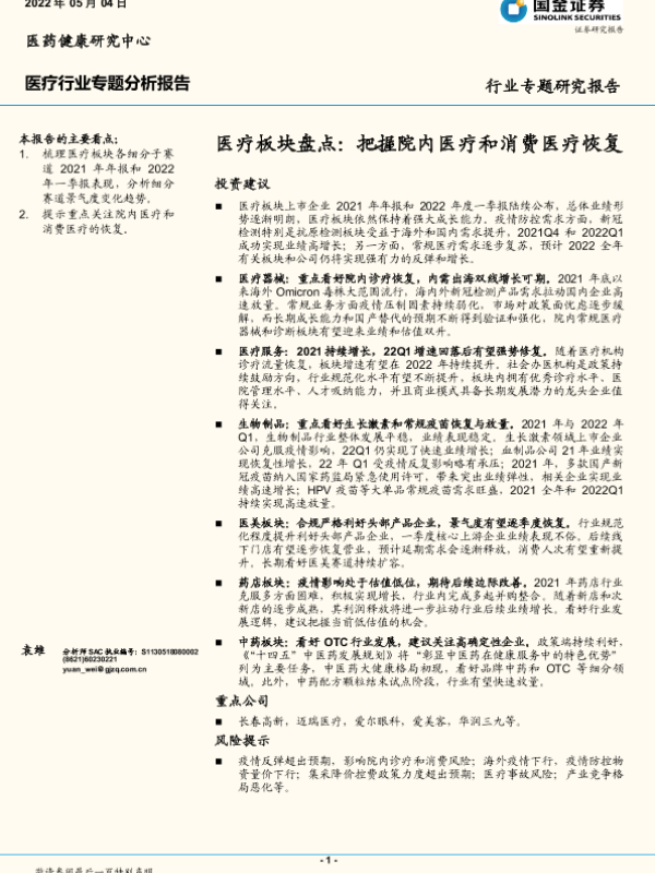 【国金证券】【20220504】医疗行业板块盘点:把握院内医疗和消费医疗恢复-22页
