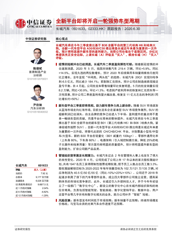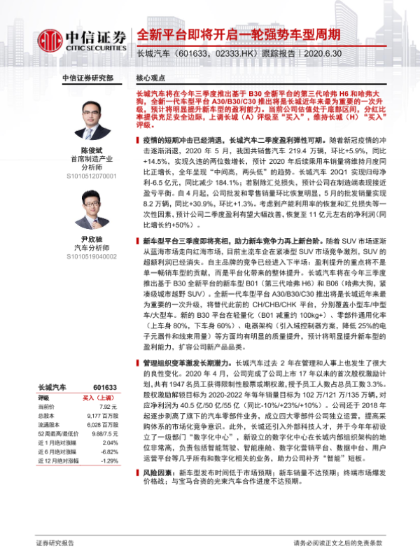 【中信证券】【20200630】20200630-中信证券-长城汽车-601633.SH-跟踪报告:全新平台即将开启一轮强势车型周期-23页
