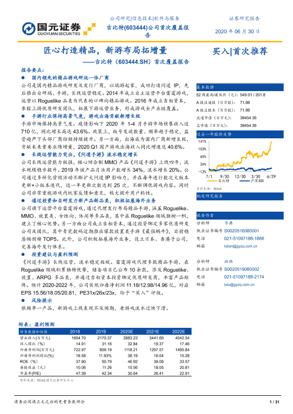 【国元证券】【20200630】匠心打造精品,新游布局拓增量——吉比特(603444.SH)首次覆盖报告-31页