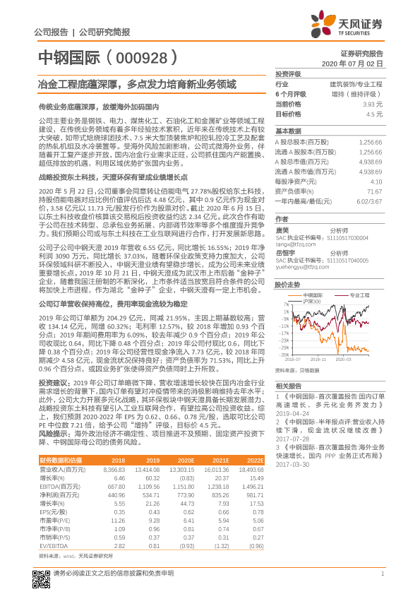 【天风证券】【20200702】中钢国际-000928.SZ-冶金工程底蕴深厚,多点发力培育新业务领域-20页