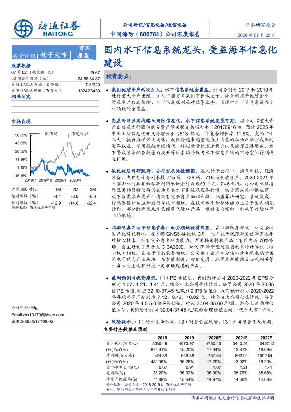 【海通证券】【20200702】中国海防-600764.SH-公司深度报告:国内水下信息系统龙头,受益海军信息化建设-35页
