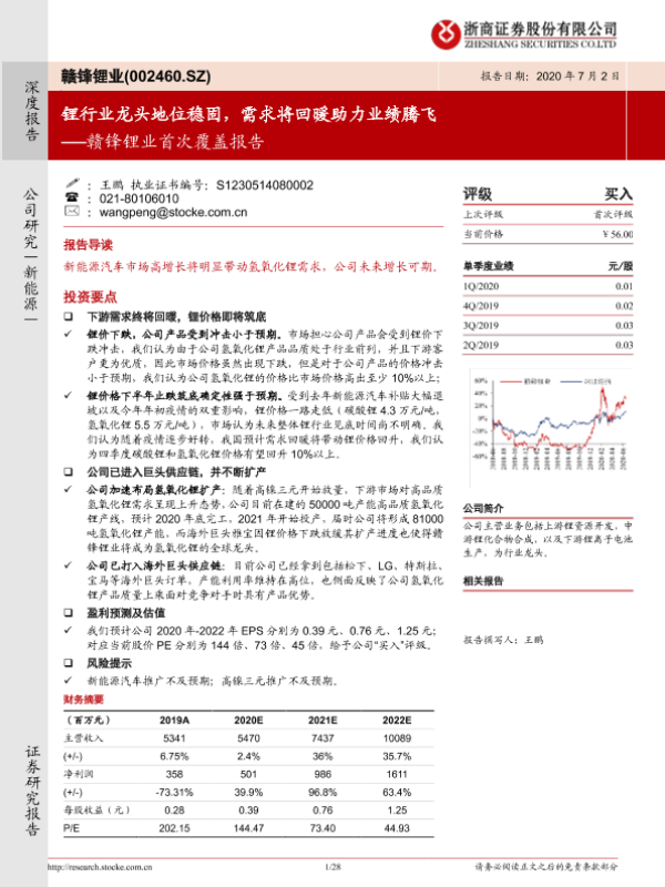 【浙商证券】【20200702】20200702-浙商证券-赣锋锂业-002460.SZ-赣锋锂业首次覆盖报告:锂行业龙头地位稳固,需求将回暖助力业绩腾飞-28页