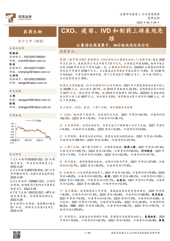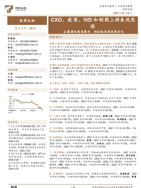 【德邦证券】【20220504】医药生物行业:CXO、疫苗、IVD和制药上游表现亮眼,公募持仓高度集中,细分板块或迎来分化-40页