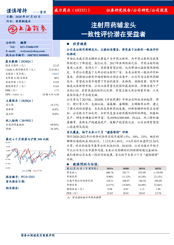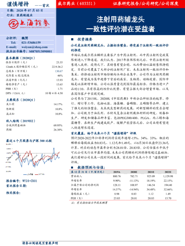 【上海证券】【20200703】20200703-上海证券-威尔药业-603351.SH-注射用药辅龙头 一致性评价潜在受益者-32页