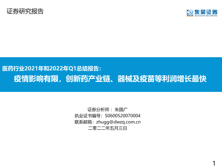 【东吴证券】【20220503】医药行业2021年和2022年Q1总结报告:疫情影响有限,创新药产业链、器械及疫苗等利润增长最快-77页
