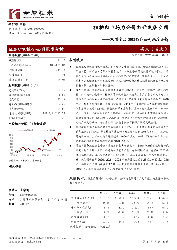 【中原证券】【20200704】双塔食品-002481.SZ-公司深度分析:植物肉市场为公司打开发展空间-18页