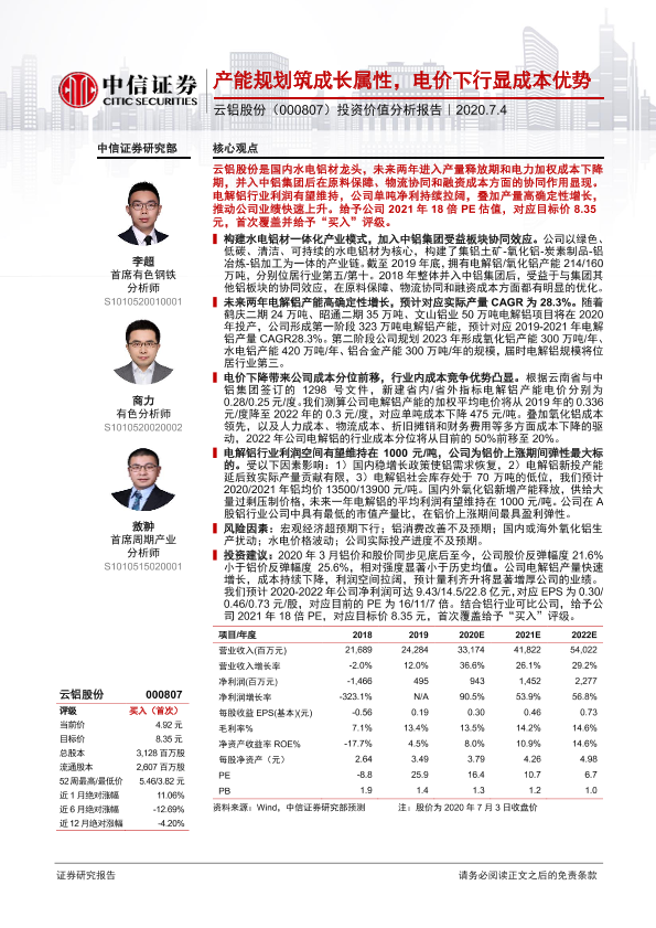 【中信证券】【20200704】20200704-中信证券-云铝股份-000807.SZ-投资价值分析报告:产能规划筑成长属性,电价下行显成本优势-29页