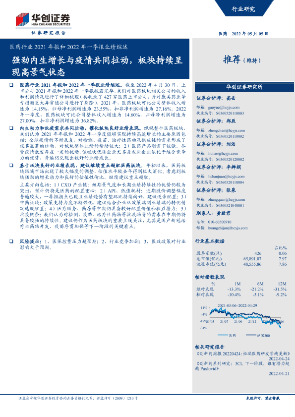 【华创证券】【20220505】医药行业2021年报及2022年一季报业绩综述:强劲内生增长与疫情共同拉动,板块持续呈现高景气状态-25页