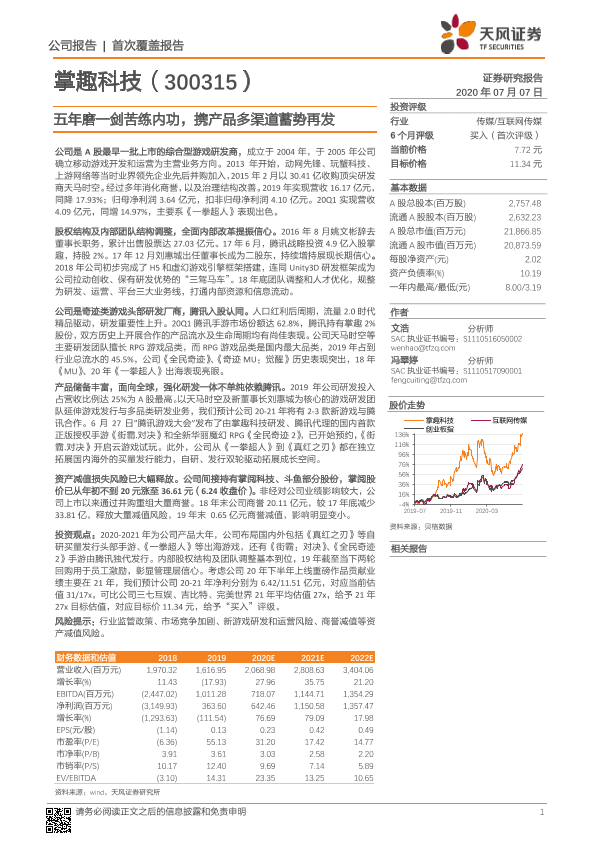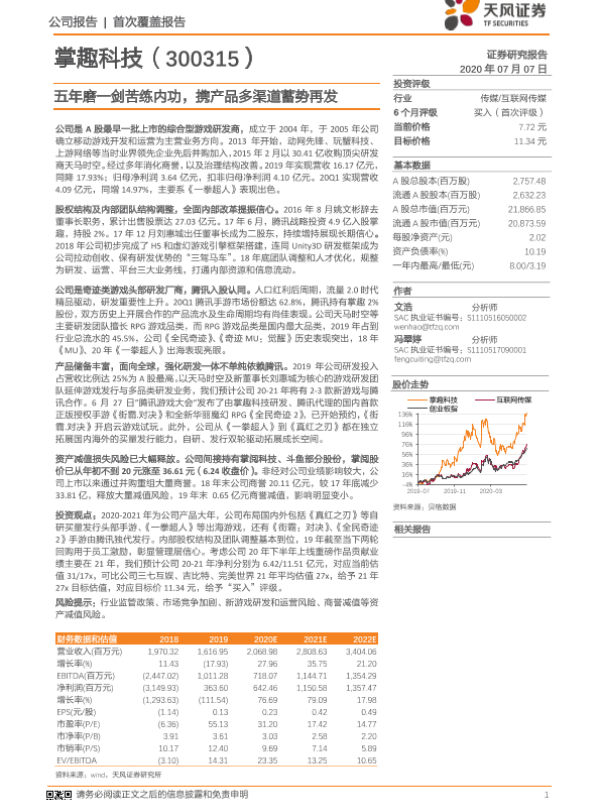 掌趣科技 游戏研发 移动游戏 腾讯合作 财务分析