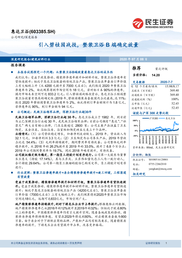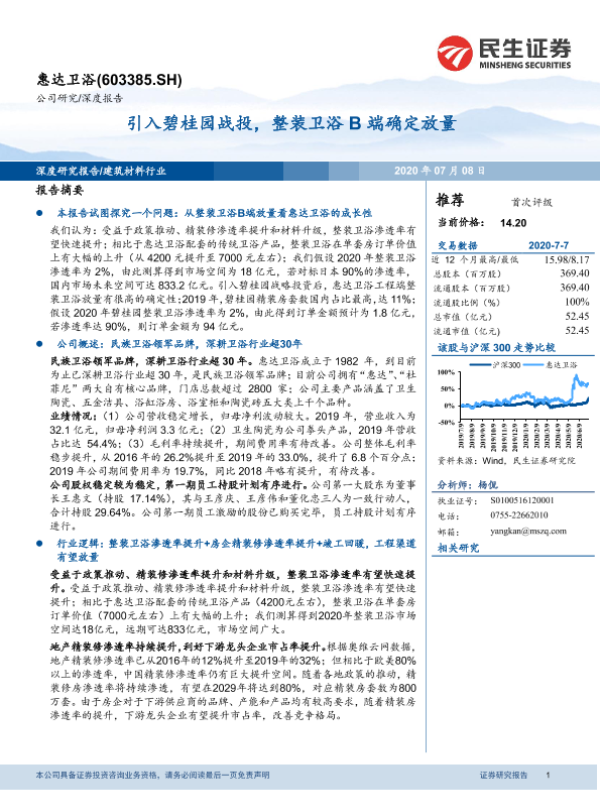【民生证券】【20200708】惠达卫浴(603385.SH)-引入碧桂园战投,整装卫浴B端确定放量-30页