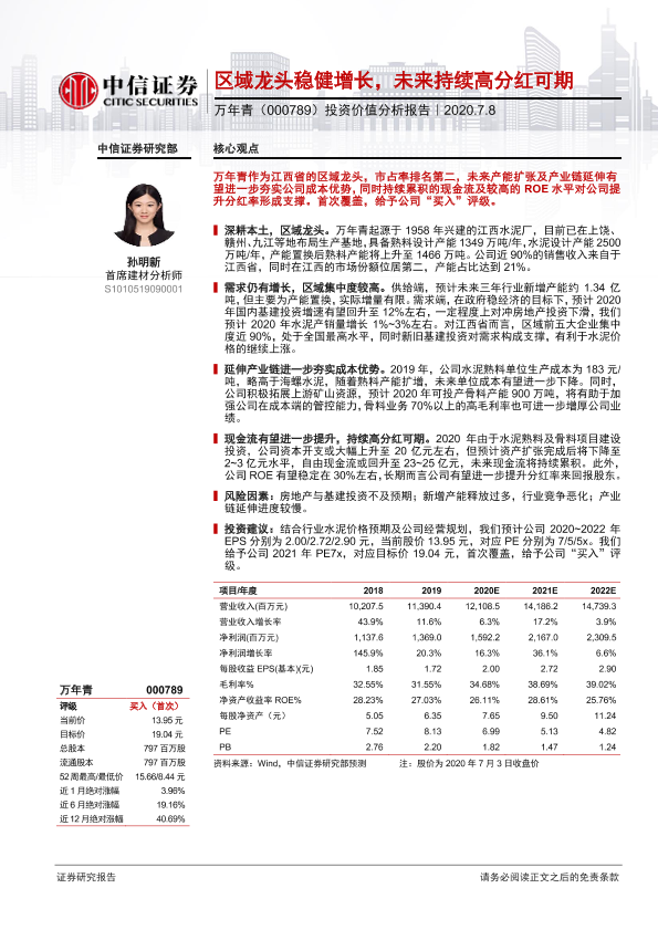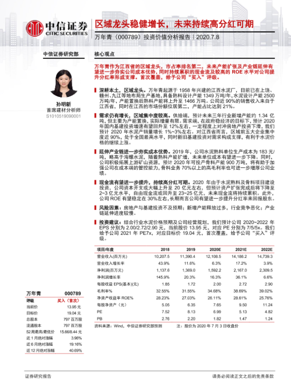 【中信证券】【20200708】20200708-中信证券-万年青-000789.SZ-投资价值分析报告:区域龙头稳健增长,未来持续高分红可期-22页