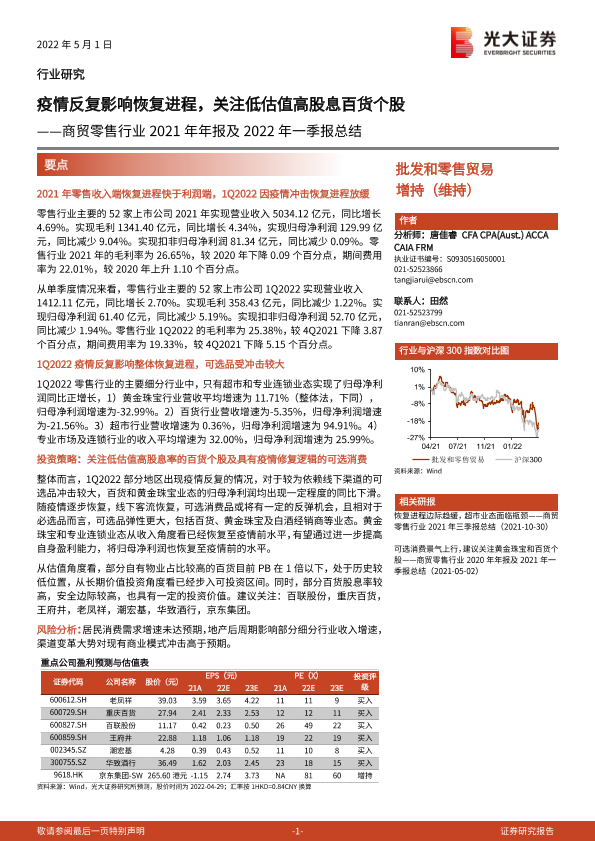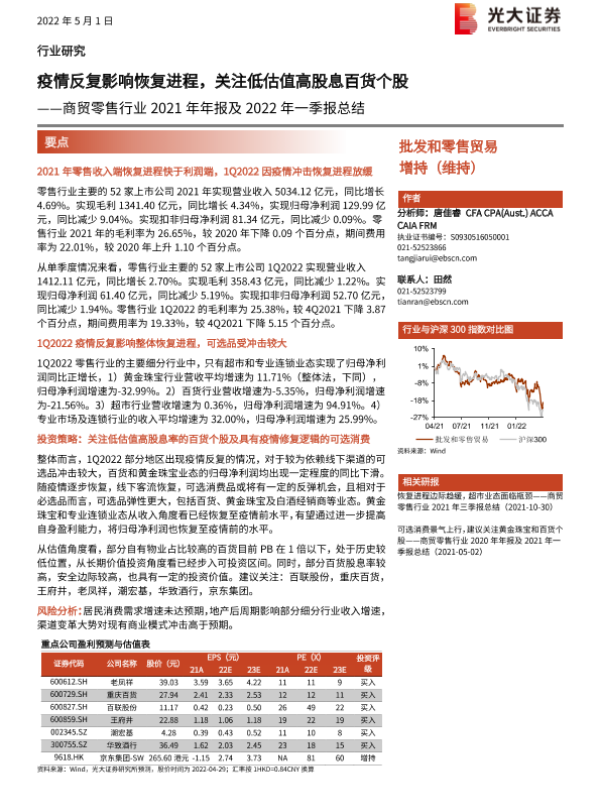 【光大证券】【20220501】商贸零售行业2021年年报及2022年一季报总结:疫情反复影响恢复进程,关注低估值高股息百货个股-21页