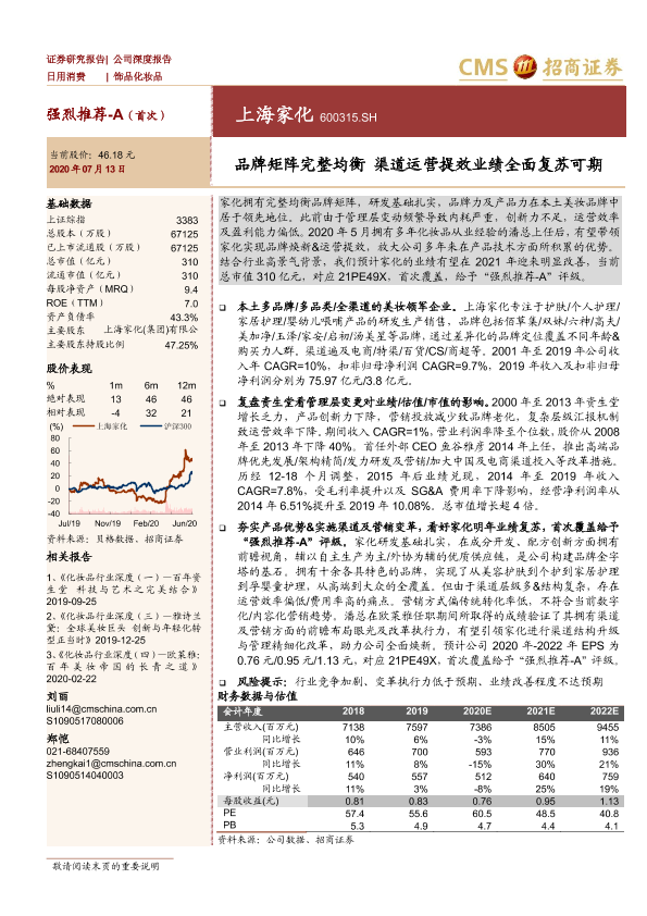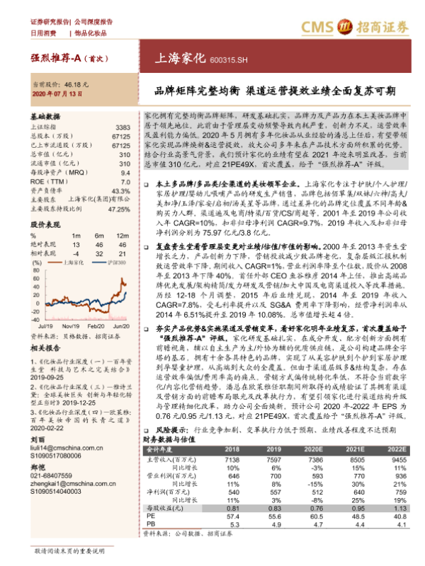 上海家化 业绩复苏 化妆品 品牌矩阵 渠道运营