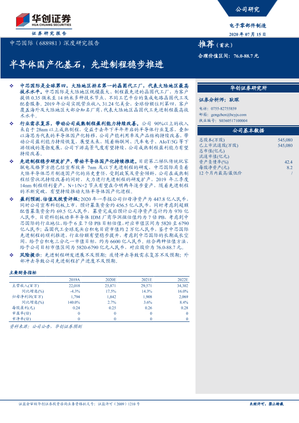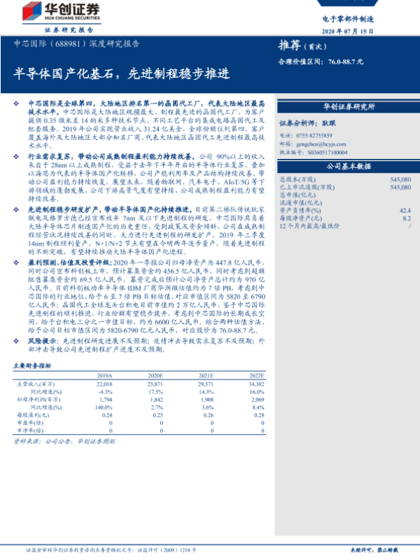 【华创证券】【20200715】20200715-华创证券-中芯国际-688981.SH-深度研究报告:半导体国产化基石,先进制程稳步推进-32页