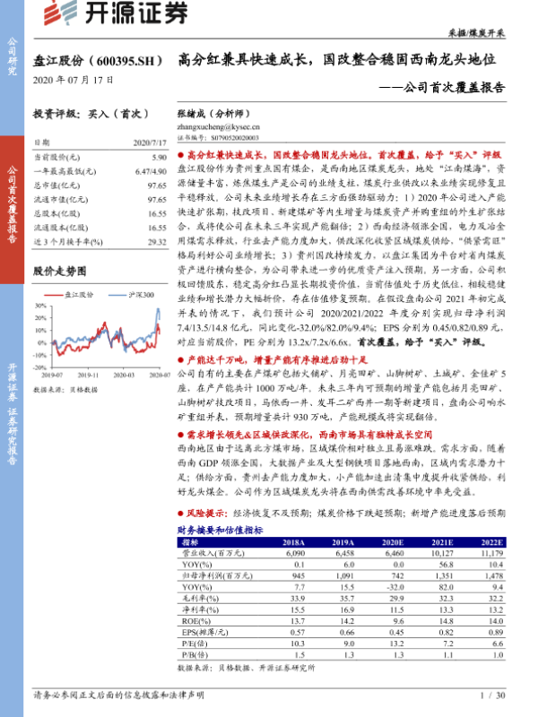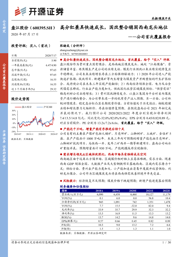 【开源证券】【20200717】20200717-开源证券-盘江股份-600395.SH-公司首次覆盖报告:高分红兼具快速成长,国改整合稳固西南龙头地位-30页