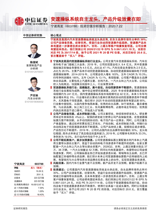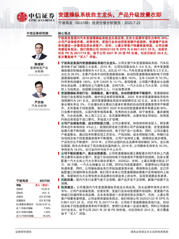 【中信证券】【20200722】20200722-中信证券-宁波高发-603788.SH-投资价值分析报告:变速操纵系统自主龙头,产品升级放量在即-20页