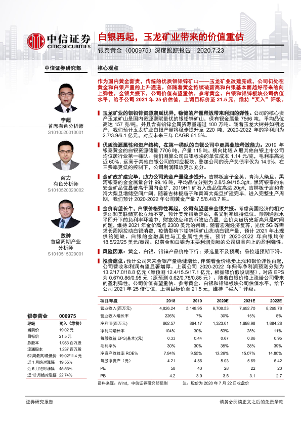 【中信证券】【20200723】20200723-中信证券-银泰黄金-000975.SZ-深度跟踪报告:白银再起,玉龙矿业带来的价值重估-22页