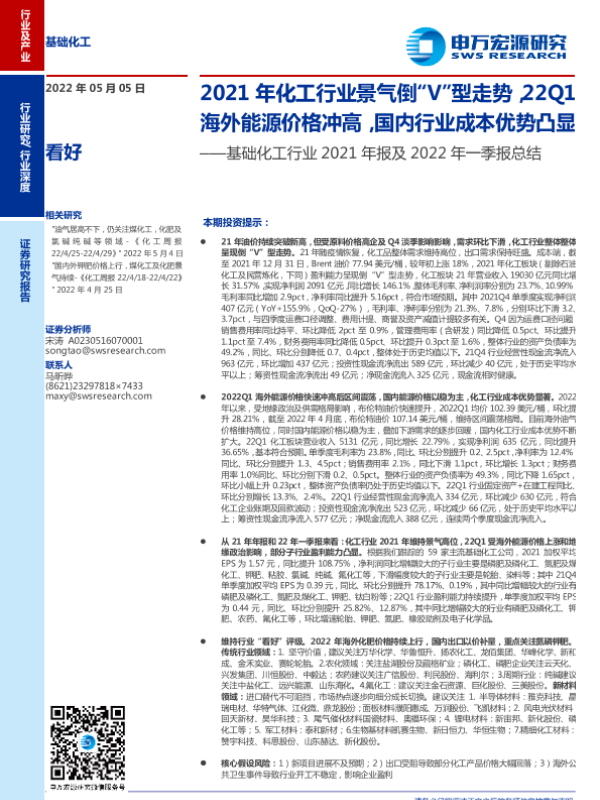 【申万宏源】【20220505】21年报及2022年一季报总结:2021年化工行业景气倒“V”型走势,22Q1海外能源价格冲高,国内行业成本优势凸显-30页