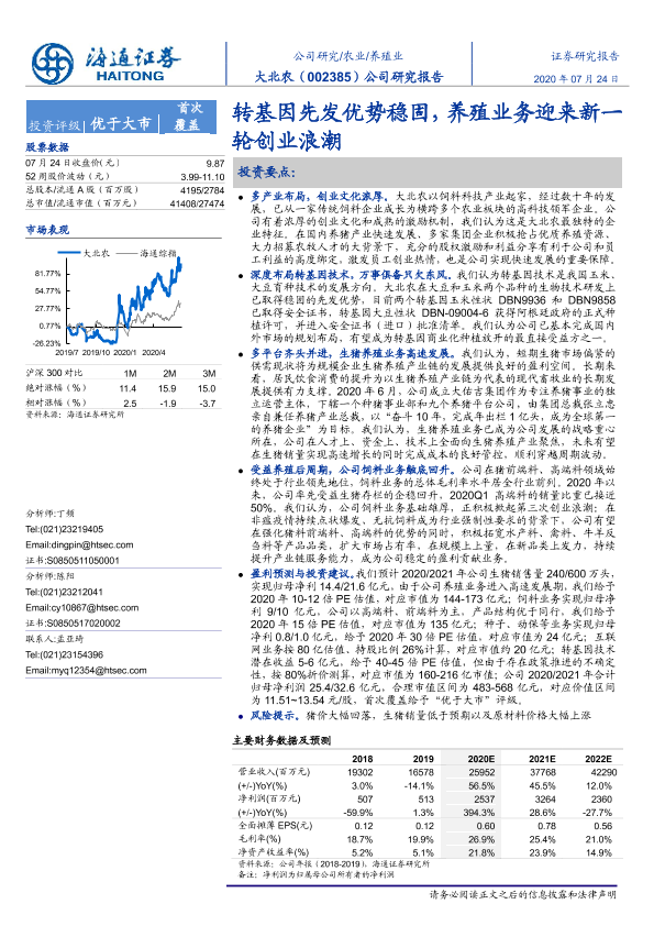 【海通证券】【20200724】大北农-002385.SZ-公司研究报告:转基因先发优势稳固,养殖业务迎来新一轮创业浪潮-22页