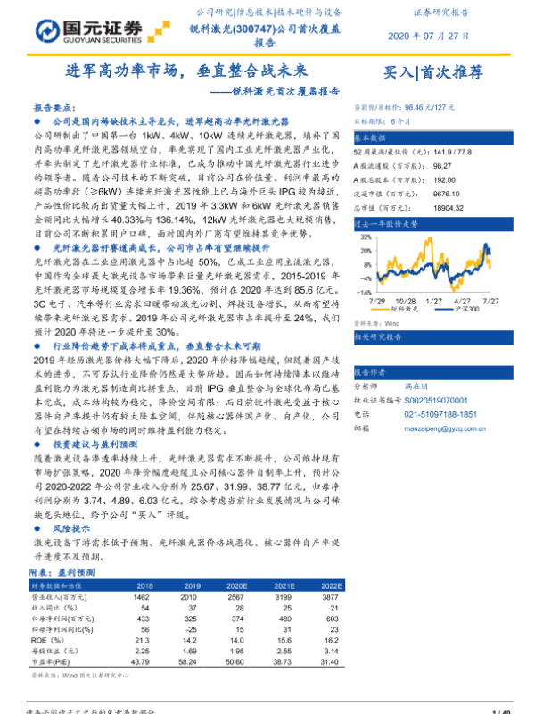【国元证券】【20200727】锐科激光首次覆盖报告:进军高功率市场,垂直整合战未来-40页
