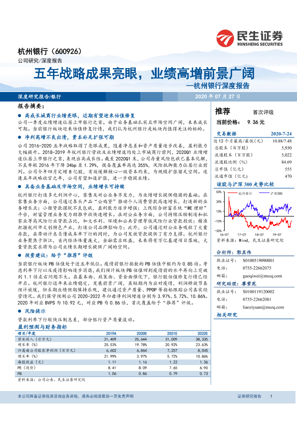 【民生证券】【20200727】20200727-民生证券-杭州银行-600926.SH-杭州银行深度报告:五年战略成果亮眼,业绩高增前景广阔-31页