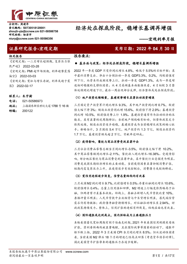 【中原证券】【20220430】宏观利率月报:经济处在探底阶段,稳增长基调再增强-17页