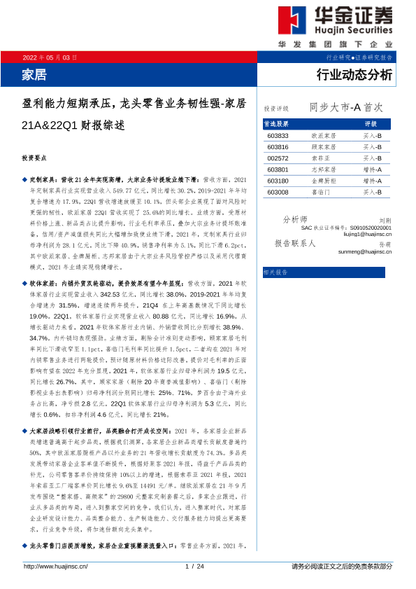 【华金证券】【20220503】家居行业21A&22Q1财报综述:盈利能力短期承压,龙头零售业务韧性强-24页