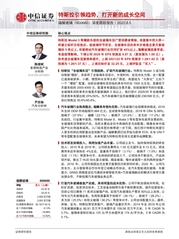 【中信证券】【20200805】20200805-中信证券-福耀玻璃-600660.SH-深度跟踪报告:特斯拉引领趋势,打开新的成长空间-22页