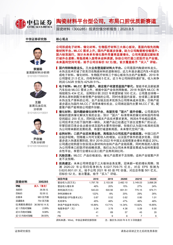 【中信证券】【20200805】20200805-中信证券-国瓷材料-300285.SZ-投资价值分析报告:陶瓷材料平台型公司,布局口腔优质新赛道-53页