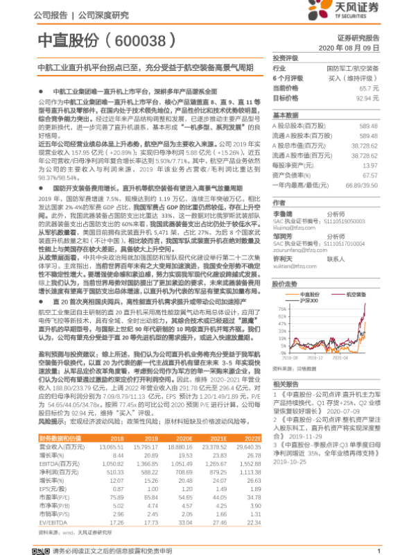 【天风证券】【20200809】中直股份-600038.SH-中航工业直升机平台拐点已至,充分受益于航空装备高景气周期-9页