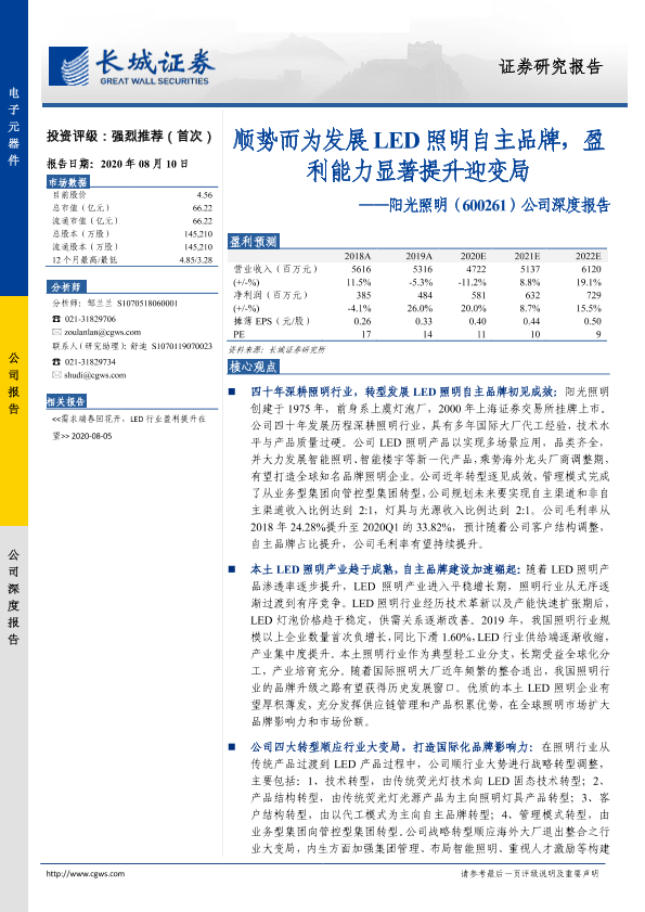 【长城证券】【20200810】20200810-长城证券-阳光照明-600261.SH-公司深度报告:顺势而为发展LED照明自主品牌,盈利能力显著提升迎变局-23页