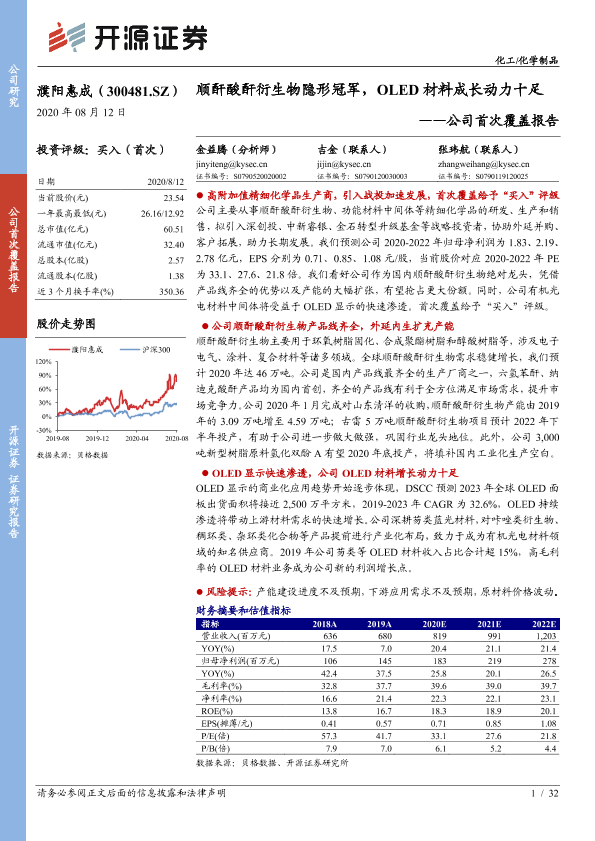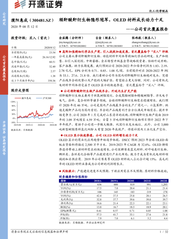 【开源证券】【20200812】20200812-开源证券-濮阳惠成-300481.SZ-公司首次覆盖报告:顺酐酸酐衍生物隐形冠军,OLED材料成长动力十足-32页