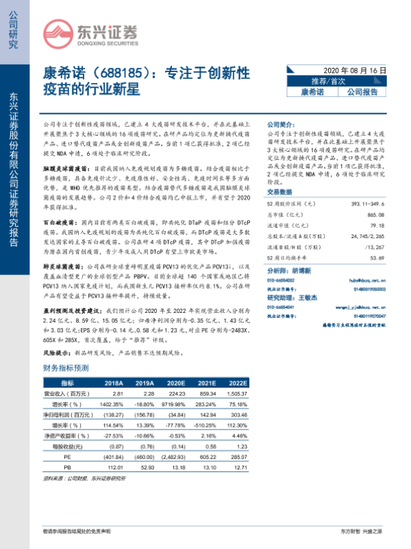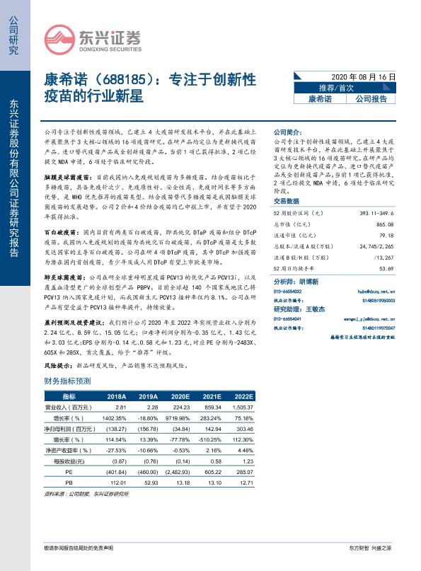 创新疫苗 康希诺 生物医药 疫苗研发 证券分析