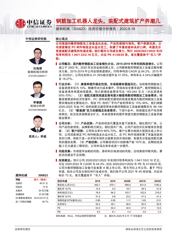 【中信证券】【20200818】建科机械-300823.SZ-投资价值分析报告:钢筋加工机器人龙头,装配式建筑扩产弄潮儿-26页