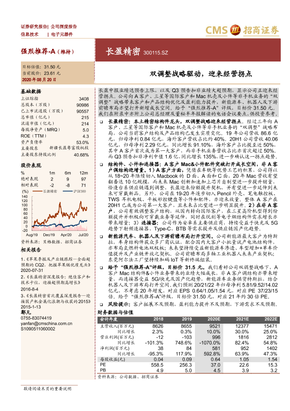 双调整战略 新能源汽车 电子元器件 经营拐点 长盈精密