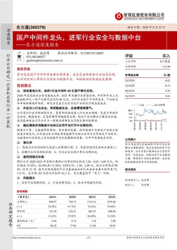 【浙商证券】【20200823】东方通深度报告:国产中间件龙头,进军行业安全与数据中台-21页