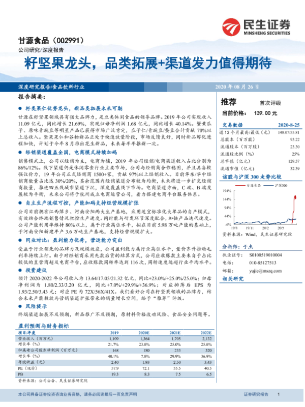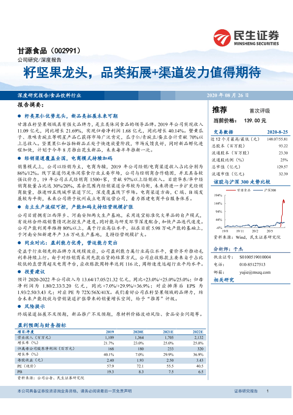 【民生证券】【20200826】甘源食品(002991)籽坚果龙头,品类拓展+渠道发力值得期待-26页