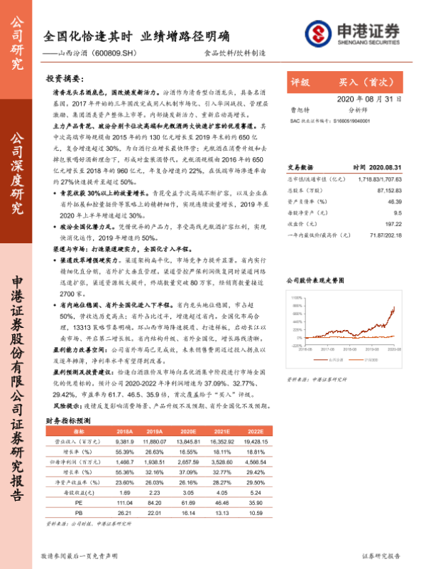 【申港证券】【20200831】全国化恰逢其时 业绩增路径明确——山西汾酒(600809.SH)-37页