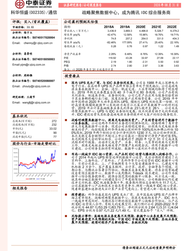 【中泰证券】【20200831】20200831-中泰证券-科华数据-002335.SZ-战略聚焦数据中心,成为腾讯IDC综合服务商-34页