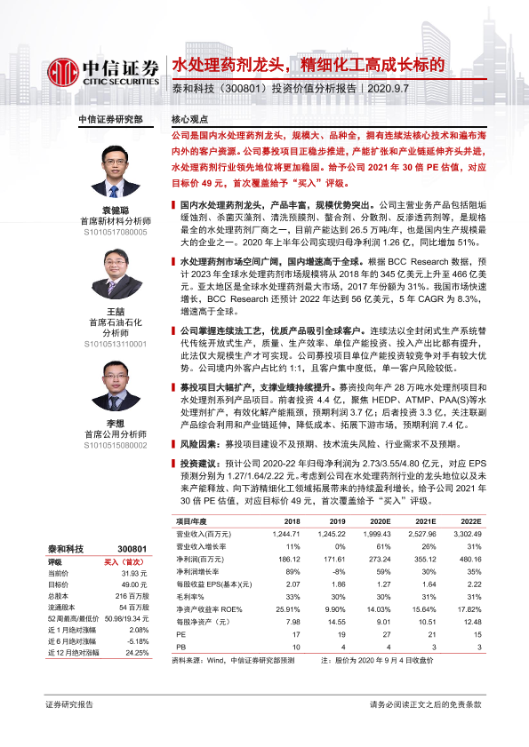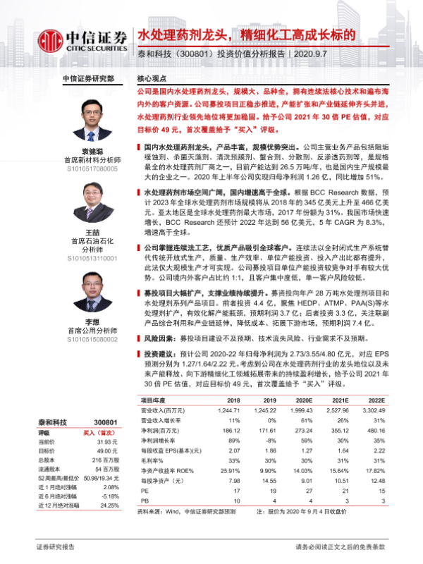 【中信证券】【20200907】20200907-中信证券-泰和科技-300801.SZ-投资价值分析报告:水处理药剂龙头,精细化工高成长标的-26页